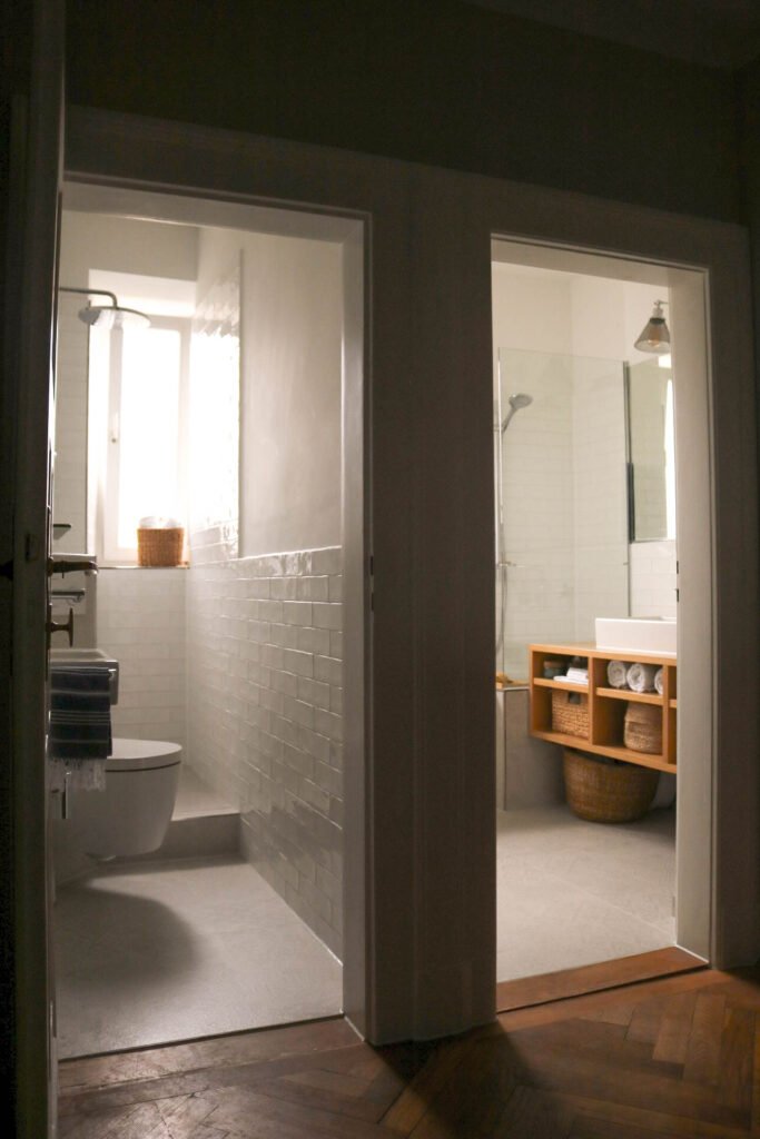 Umbau von einem Badezimmer / Schlauch-WC zu zwei vollwertigen Badezimmern